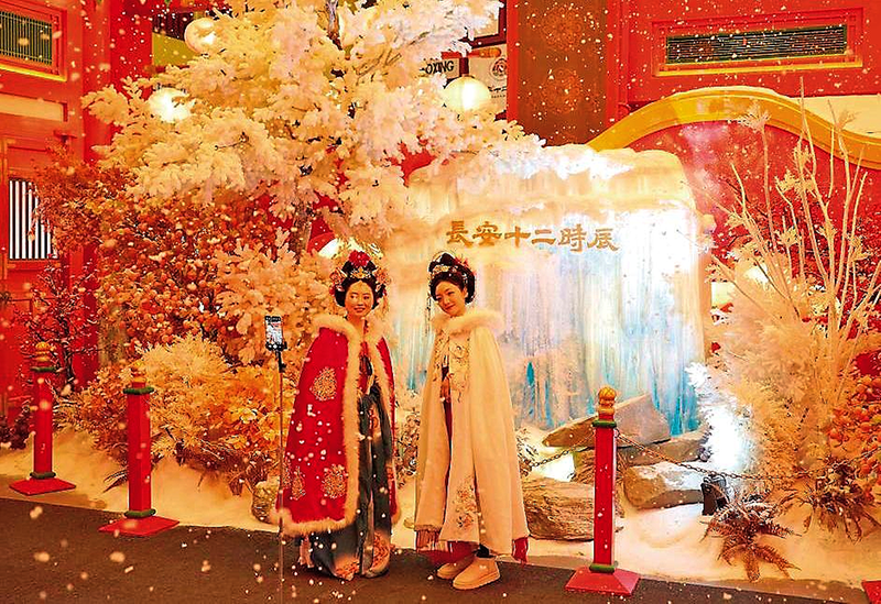 12月23日,游客在街区以冬日长安雪景为主题的场景中拍照。