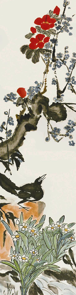 刘宏乐 《鸟语花香》 纸本设色 138cm×34cm 2025年 刘宏乐同学,2008年生于岐山县凤鸣镇,十岁起随曹宇先生学习中国画,现就读于岐山县职业教育中心。他的水墨作品展现出超越年龄的文化感知与艺术灵性,在七年持之以恒的习画历程中,既保留了少年视角的纯真,也沉淀下扎实的笔墨功底。