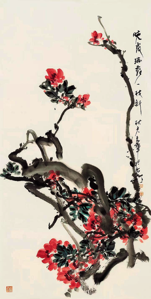 林兵《晓霞瑞露一枝新》纸本设色 136cm×68cm 2024年