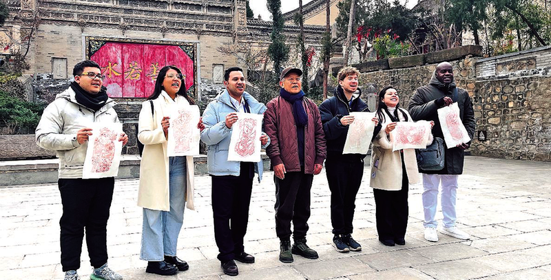 1月14日,在关中民俗博物院,拉美青年文学翻译家体验木版年画制作技艺