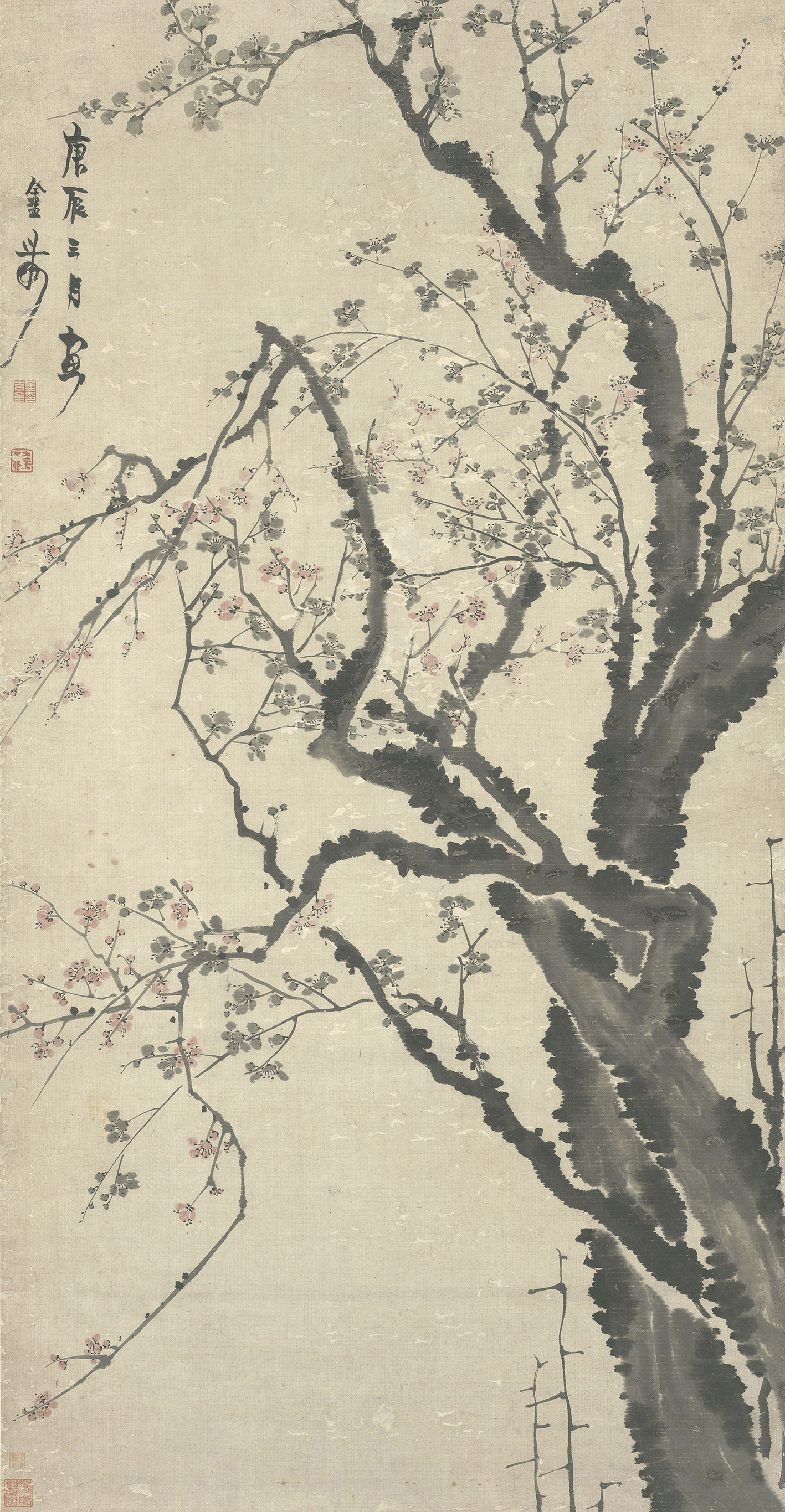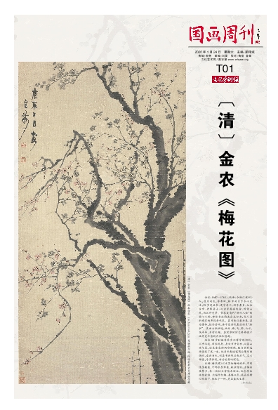 〔清〕 金农 《梅花图》 纸本设色 116.3cm×60.2cm 美国纳尔逊·阿特金斯艺术博物馆藏 金农(1687—1763),钱塘(今浙江杭州)人,原名司农,字寿田,30岁始自号冬心先生,39岁更名农、更字寿门,别号甚多,如金吉金、昔耶居士、心出家庵粥饭僧、稽留山民、曲江外史等。金农是清代“扬州八怪”的核心人物,碑派书法的杰出先行者,文人画新境界的开拓者代表。其书法以隶为基,溢为诸体,拙朴清峭,其中最具代表性的是“漆书”。其画古拙怪逸,画竹、梅、马、佛、山水、花卉等,多有长题。其深厚的诗文修养赋予画作更丰富的内涵和意趣。