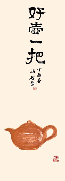 裁了素宣,一身清白的茶壶画毕,竹峰来电又要落款,说还是你的款好。那些提前画好的原作是按照不落款格式画的,场地留白小,只题穷款。