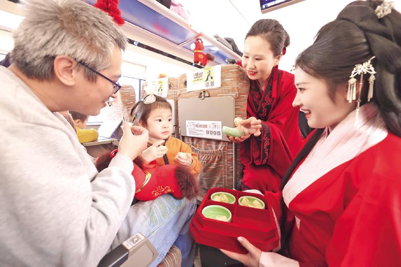 互动环节中,教育员现场讲述“彩绘骑马俑”的文物故事,并组织旅客学习编织吉祥结、平安结,将美好祈愿系于绳结;带领旅客探秘汉代太初历,手绘马年台历并标注汉代节日;循汉代礼仪共享“马蹄酥”特色糕点,让旅客在味蕾体验中感受古礼文化。此外,汉代舞蹈《马踏飞燕》、魔术《踏花归去》、蒙古族舞蹈《快马逐风》等节目年味十足,为旅途增添欢乐氛围。