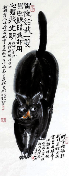 以上说的抽象黑暗,我须转化为具体黑暗,我画猫是对的。黑暗用一只猫身子轻松遮掩起来,黑色的诗句被吸收进猫的体内,化为它的骨骼或毛皮,成为一泊黑魂。落款时我用一个字“黑”,写满整纸。