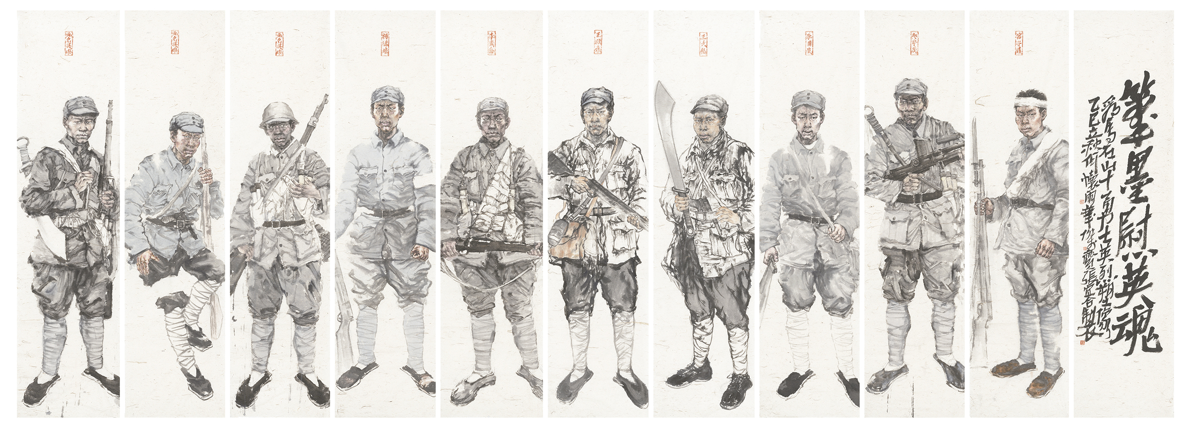 何怀雨 《笔墨慰英魂——为马石山十勇士塑像》 纸本设色 240cm×660cm 2025年