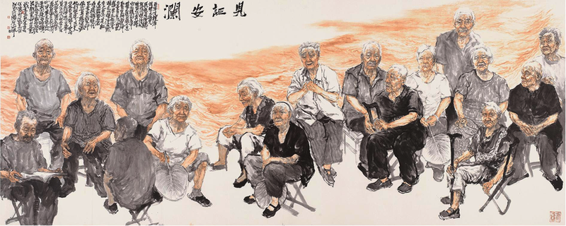 《见证安澜》描绘了夏季黄河岸边17位百岁老人乘凉的场景。作品没有表现黄河的恢宏与激荡,而是通过老人脸上的笑容、承载历史印记的皱纹,以及背景中奔流不息的黄河水涛,见证并述说着黄河的百年近代史,展现出新中国新时代治理黄河、化害为利、福泽黎庶的历史功绩,让人体会到画作中的和谐、和满、和美、和安的高尚思想境界。