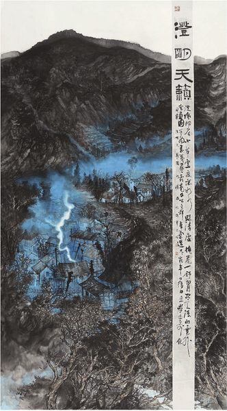 《澄明天籁》以绘山村幽蓝晨雾炊烟之景,将传统山水笔墨与泼彩融合,营造静谧之意境。通过线来表现物象,以墨的浓淡干湿变化营造丰富的层次感。远山层叠以浓墨皴染,近处枯枝遒劲,映出村舍烟火,虚实相生间透出山水气韵。强化画面中色彩视觉张力,在墨色氤氲间感受笔墨趣味,又通过蓝色处理,让观者感受到天籁般的自然律动。