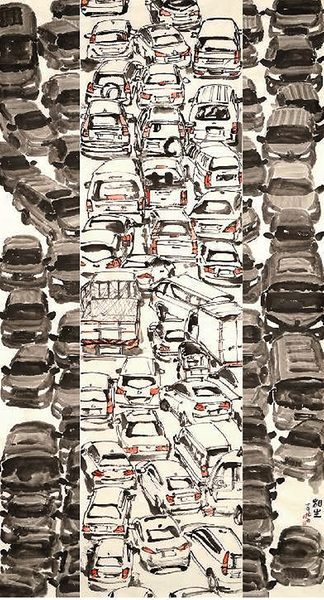 在《相生》的创作中,围绕“汽车时代”这一主题,充分运用点、线、面的对比与组合。汽车形象做几何性处理,采用黑白对比、方向对比,物象以点状重复排列,画面中间部分以“线”来表现,两侧的画面以“面”来体现,使线与面统一在画面中,构建出中国画黑白相生、虚实呼应的意境。题材选取车水马龙之景,色彩为次,强化形式感,构图饱满,削弱空间感,而呈笔墨趣味形式美。