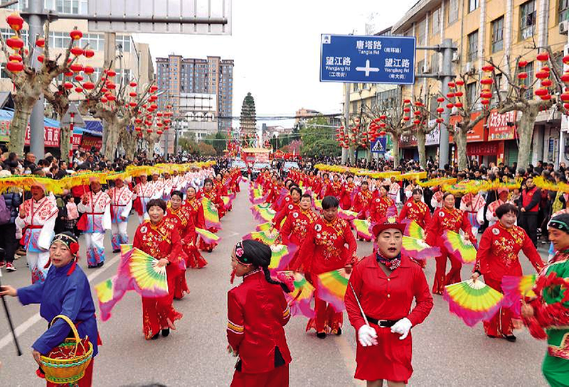 百余支社火方阵浩荡出发,绵延数里,蔚为壮观。百人锣鼓方队气势如虹,扇子舞与秧歌队彩扇翻飞、步履生风,雄狮跃动、巨龙盘旋,尽显朱鹮之乡的蓬勃朝气与百姓生活的幸福安康。