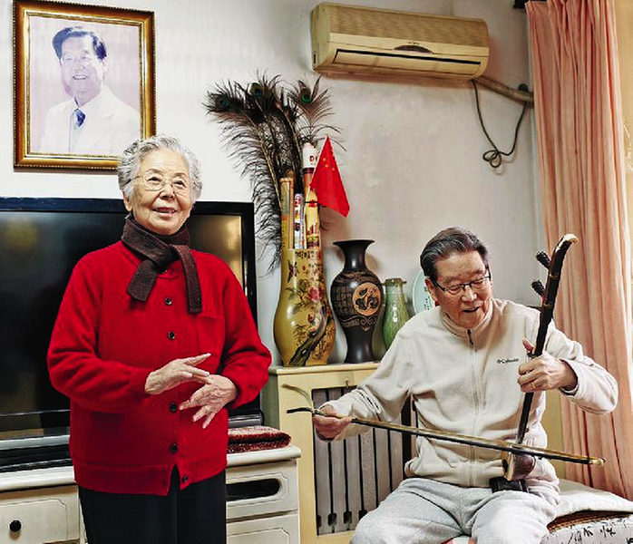 王毓娴(左)与老伴儿张长兴在家中练戏