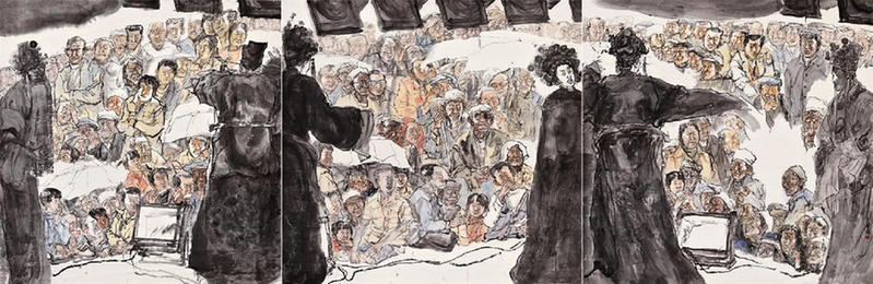 王潇 《看大戏(卷一)》 纸本设色 200cm×600cm 2010年 美国哲学家杜威在《艺术即经验》一书中的论述,或可于此作为一个精妙的理论注脚。杜威认为“经验”产生于活的生物与环境的持续互动,其中既有环境施加于生物的“承受”(undergo),也有生物作用于环境的“作为”(do)。这样的经验是一种主客交融、不断在失衡与再平衡中动态生成的产物。艺术并非孤立情感的喷射,而是“一个经验”的完满表现。杜威对完整经验的强调,并非否定情感所能,而是要为情感找到一个更丰满而真实的“容器”,避免沦为立场先行的简单爱憎,使艺术陷入一种狭隘的“片面的美”。
