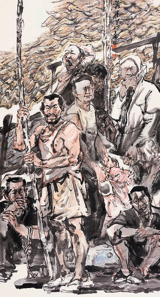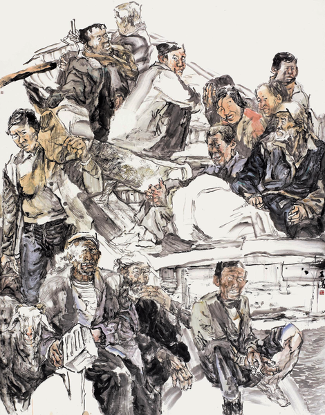 复审读《艰生》(2011年)一作,则更进一步。画中石匠的躯干、衣纹线条,与身后石堆的“小斧劈皴”浑然交融于一片笔墨生生之中,面部则以速写式的精练短线勾勒结构,与谢赫“骨法用笔”精神相通。初看仿佛混沌未开,细观则物象粲然。这正契合老子“恍兮惚兮,其中有象”的哲思——此“象”已非表象之象,而是近乎道体的本质之象。看来,作为一个怀有深切现实关怀与人文情怀的艺术家,其念念不忘的追求,是将其感受最深也最有分量的生存体验与生命经验,“翻转”为最具个性的艺术形式,复通过艺术形式的“炼金术”转而进行艺术精神的“提纯”,最终落实并生动体现于作品。席勒的论断在此熠熠生辉:“大师的真正的艺术奥秘就在于用形式消灭内容。内容本身越雄伟,越有吸引力,越引人入胜,内容及其作用越突出,或者观众越乐意听任内容的摆布,推开内容和控制内容的艺术成功也就越大。”