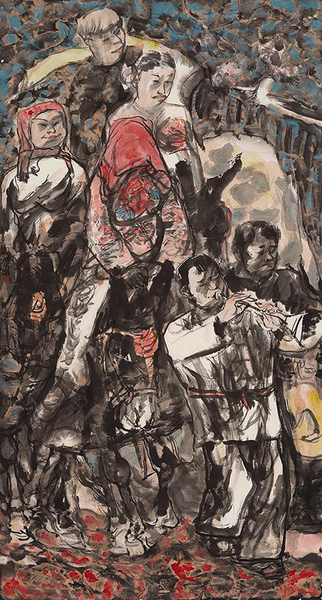 王潇 《长安旧梦》 纸本设色 182cm×145cm 2024年 一、本我 根性的光源与泥土的修辞 当代人物画家王潇,一位身心不离不弃乡土根脉的艺术行者,其全部水墨人物作品,记录与呈现的,是一种在城乡之间的精神摆渡,亦即“本我”与“本色”之根性、境遇与形态,在文化认同维度上不断肯定、否定、否定之否定的辩证乐章。从1974年4岁时的懵懂“涂鸦”,到 2023年 53 岁时以《本色》命名的大型画册,50年的艺术跋涉,他究竟校准了哪一个“我”?这一追问本身,或许正是贯穿其艺术生命的母题。