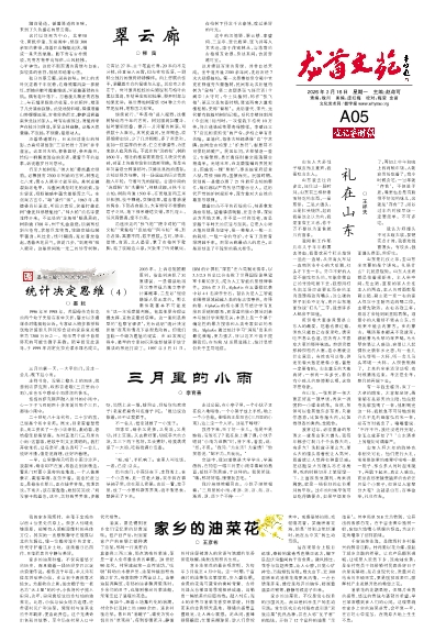 一早,山里静得只听到小雨沙沙声,我起来,母亲却不在家,等我走到涧塄边,看见门对面小溪旁的麦地边,一个人披着蓑衣、戴着草帽,在劳作着。我急忙赶过去,是母亲在那儿,正在拔荠荠菜。我埋怨说,下雨天,该在家歇歇,她却笑笑说:“妈没事干就着急,这不,恁好的荠荠菜,多嫩呀,地塄上这一堆,拔回去,好给你包疙瘩子(老家把扁食叫疙瘩子)吃。”她边说边拔着,还不让我插手。