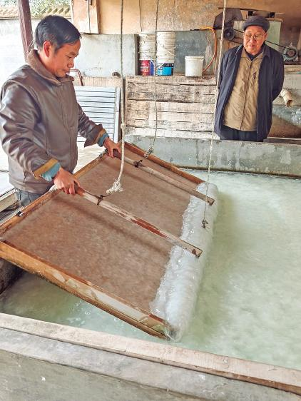 那时候村里会造纸的都上了年纪,有的耳朵背,有的腿脚不好。第一次把几个老人请到一起,人家摆手:“ 弄不动了,弄不动了。”没说几句话就不欢而散。他再去,人家还是摆手。