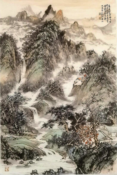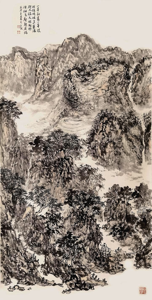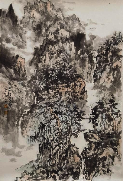 我清楚夕朝作画,不像别人单一地追逐笔墨的功夫、线条的讲究。他的心情像悠云一样静雅,并不是某一方灵域的属物,飘逸而不自诩,他的激昂写在画中,如波涌的江流,大气磅礴,而不是拦在池沼里的死水,在风的吹拂中,掀一点涟漪便自鸣得意。绘画中勾勒皴擦、点染、挥洒,信马由缰,笔墨酣畅,天趣使然。万千丘壑久存于胸,千古风云常萦心田。这些山水早在他的心海里印映出极深的印象,成为永久的“底片”。因此他写山山灵、画山山动,风情万种,令人心荡神怡。我是从不向别人求索什么的,更何况一些画家向来视自己的画作如珍物,润笔费尺幅逾千过万。对于夕朝,我总有一种情同手足的感觉。因为他的人品和近来名声的鹊起,也是我向外炫耀的一点资本。何况有人问我夕朝画的润格,我竟在酒后不假思索地说:“我与夕朝,要他画准画。”为了展示我们的交情,我还在酒桌上当众给他打了电话。他笑了,劝我少喝点,画很快就画出来……那一次,我真是挣足了面子。而夕朝给我送来的不是一幅画,而是两幅,笑着说:“喜欢你就留一幅,答应人家的就给……”行里的人都知道我的个性,有了朋友在灵魂里都搁不住,非得抖搂给别人。不为炫耀,性情使然!这一“作为”竟使得这种意趣“折腾”到国外。
