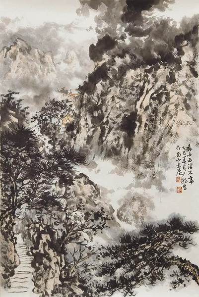看夕朝先生的画展如赏圣景。“师法自然”对于夕朝,绝不是泛泛而言。他利用出差的“结余”时间,去探华山之险,去观黄山变幻的云影,去赏五岳别致的奇观。松、云、石根固在他的画稿里,烂熟在他的心田间。一山、一水、一草、一木,山石岩隘都关联着他的真情,连接着他的挚爱。他凝神于雁荡山,注目富春江,似乎在谛听着子久老人的长啸;他跋吴山、涉浙江,仿佛为了寻找石涛先生“搜尽奇峰”而遗落的草稿。他远临马夏的画脉、元人的风骨、明四家的气韵、扬州八怪的神采。他的导师张志民先生总是强调“大美在于生活,在于体验,在于对山水的关爱。钟情于山水能得其乐、知其趣。画家要有诗者的情怀、仁者的关爱”。正因为此,夕朝久久眷恋着泰山的风貌而流连忘返。他熟悉这里的险隘、巍峨的山脉。他愿聆听入夜的松涛,更愿看那荡胸而生的层云。