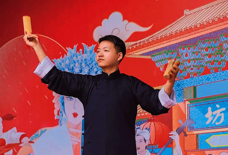 西安市说唱艺术团董驰演出现场 西安演艺集团供图 文化艺术报讯(全媒体记者 张惠妹)近日,西安市说唱艺术团演员、陕西快板非遗传承人、第十二届“陕西好青年”董驰,携快板、秦腔、顶灯三项非遗绝技及经典曲艺名篇,在深圳坪山龙马社长守戏剧公社开展《长守·非遗》系列陕西快板专场演出,让源自三秦大地的古老非遗技艺走进岭南客家围屋,在南北文化的交融碰撞中,实现非遗的活态传承与创新发展。