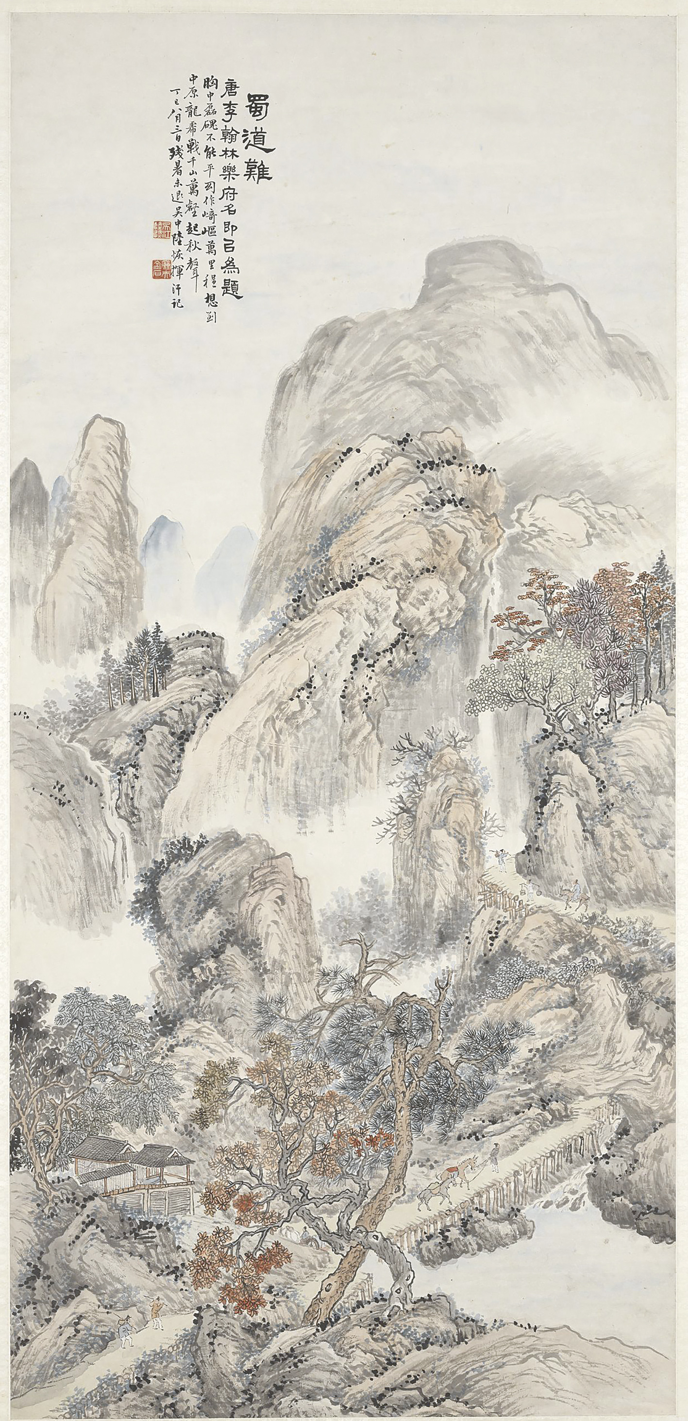 陆恢 《蜀道难》 纸本设色 157cm×74.5cm 1917年 台北故宫博物院藏 陆恢(1851—1920),原名友恢,一名友奎,字廉夫,号狷叟、狷盦、破佛盦主人等,原籍江苏吴江,居苏州。工隶书,画则山水、人物、花鸟、果品无一不能。曾为寺僧,观十八应真像,即以纸墨描摹。而后游历三湘及辽东名胜,所历既广,则笔意益加苍劲古拙。曾作《衡山记游图》8幅,自诩为生平杰作,可媲美黄易《访碑图》。中年后归苏州静心潜居,为吴大澂幕府。其间近30年书画创作不辍,并热衷于考订金石文字。黄宾虹曾评其曰:“以吴江陆廉夫得名最早,山水学‘四王’,渲染尤能逼真。”