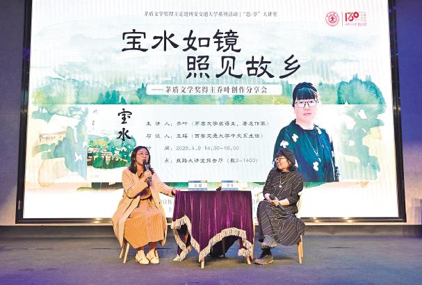 王瑶(左)与乔叶(右)对谈 任俊丞/摄 文化艺术报讯(全媒体记者 任俊丞)4月9日,正值西安交通大学建校130周年暨西迁 70周年之际,“宝水如镜,照见故乡——茅盾文学奖得主乔叶创作分享会”在西安交通大学兴庆校区举行。第十一届茅盾文学奖获得者、北京老舍文学院专业作家、北京作协副主席乔叶莅临校园,与该校师生亲切交流。