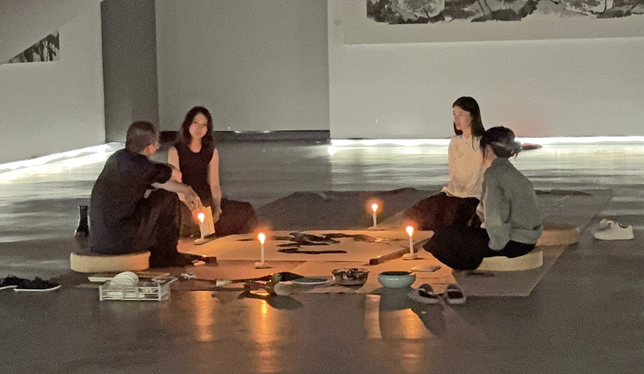 以䔇自幼随明羽习书,却走向了更为开阔的现代开拓。她基本功扎实,对临摹的准确度几近苛刻,一行字往往临摹几十遍,老师认为可以过关了,她却还要再三纠结。艺术的标准从来不在观者,而在自我的探索与肯定。她一直在探索书法的空间性,这源于她本科专业——京都艺术大学建筑学的学习。她毕业时为父亲设计了眠虹艺术馆,此后便与建筑设计告别,但骨子里对空间关系的关注一直都在,硕士论文便是涉及书法本身存在的多维空间,读第二个硕士学位时则转向美学探究。