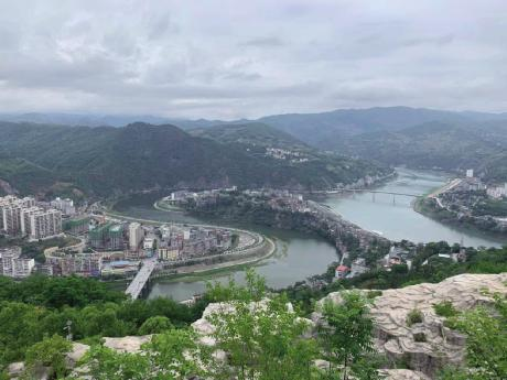 李志安 摄 站在旬阳市宋家岭观景台远眺,旬河自北而来,在此处拐出一道大弯,盘成一个S形,恰好将老城围了大半。汉江从西边奔来,横亘在城南,两江就在此交汇。有人指着河湾里的民居笑道:“你看,那活脱脱就是一幅太极图啊!”仔细看去,确实像极了。