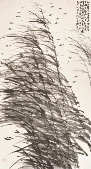 张勇涛 《江空蔟冷烟》 纸本水墨 180cm×97cm 2025年 张勇涛君携其近年所作书画作品示我。观其作品,一股圆厚沉雄而又清雅灵动之气扑面而来,令人耳目一新。